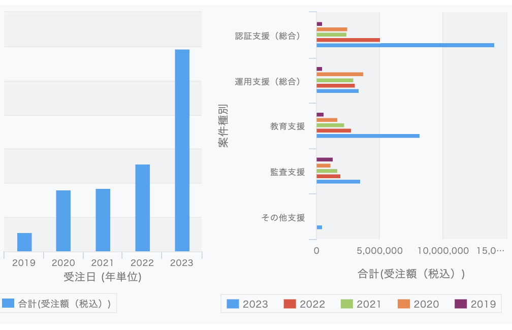 2019年一般社団法人マネジメントシステム品質協会創設から5期目を迎えた2023年8月31日までの支援内容別の受託推移です。