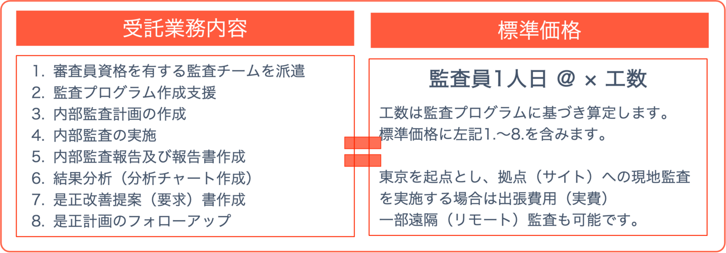 (2019年に初回実施しましたが、2020年も継続的にチーム派遣による監査を依頼) - ISMS運用企業:担当者が退職(監査リーダー)が退職したため、新たに採用もしくは育成する時間とコストを考えると内部監査を委託したい。